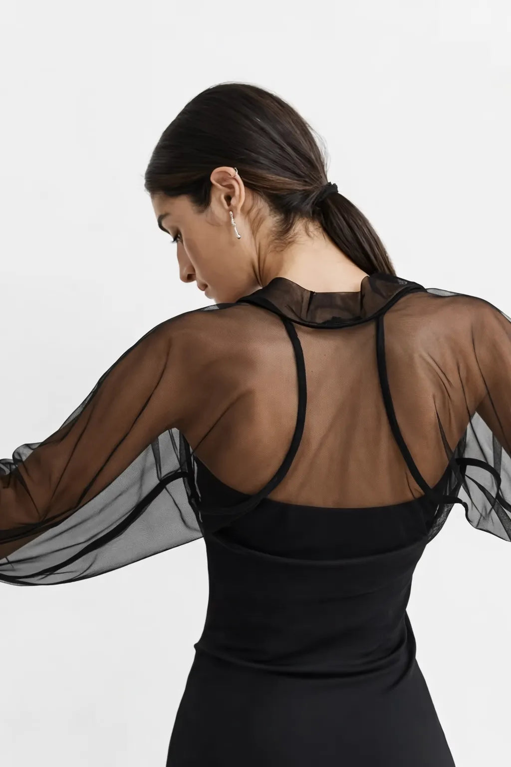 Ce boléro noir est pensé pour celles qui veulent affirmer leur style avec une pièce originale et élégante. Il se marie parfaitement avec une robe blanche minimaliste, une robe de mariée moderne ou une tenue de soirée chic. Sa transparence et ses manches volumineuses structurent la silhouette tout en conservant une sensation de légèreté.