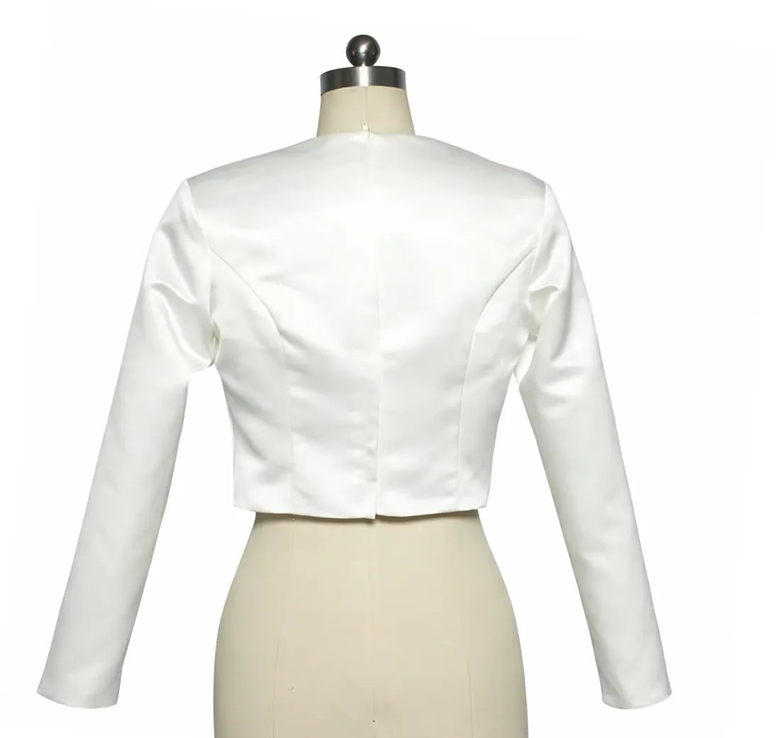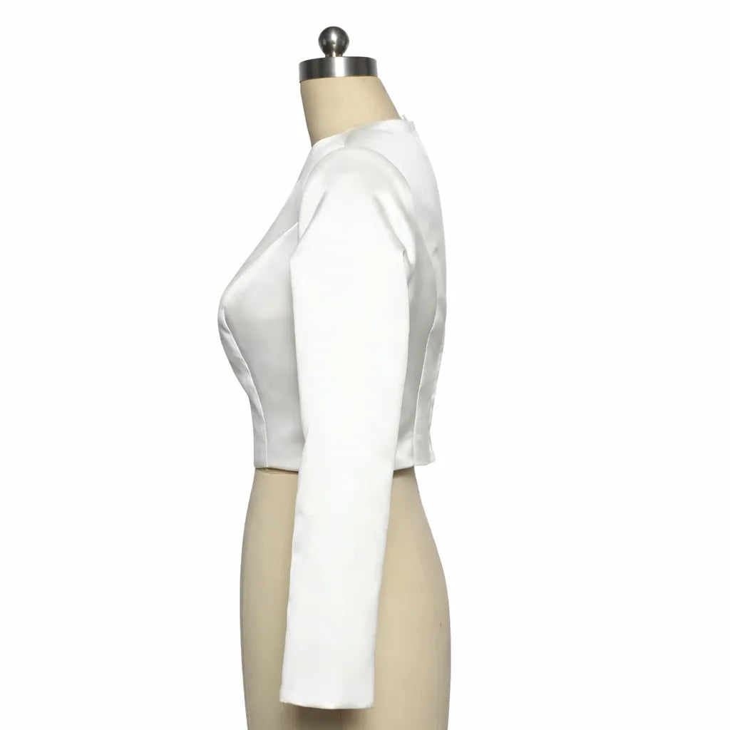 Ce boléro en satin blanc lisse et brillant ajoute une touche de raffinement à votre tenue. Sa coupe fluide et structurée assure une allure chic et moderne, parfaite pour compléter une robe de cérémonie.