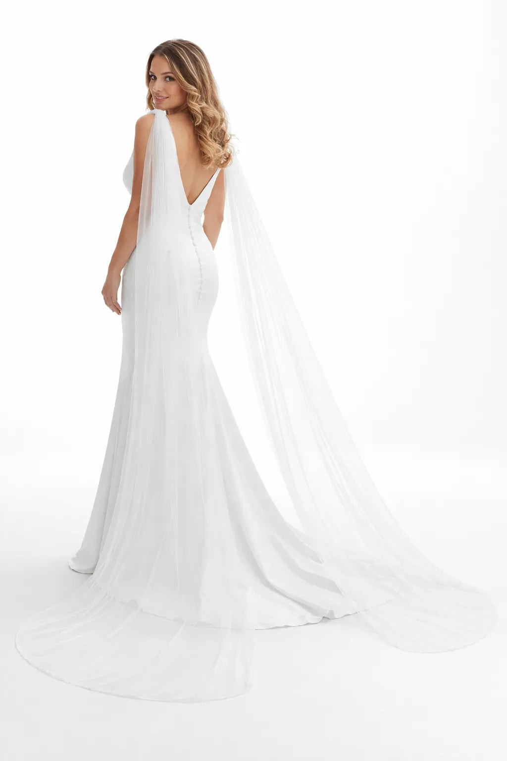 Le mouvement naturel des deux pans crée un rendu spectaculaire à chaque pas. Cette cape transforme instantanément votre allure, idéale pour la cérémonie, l’entrée dans l’église ou le shooting photo.