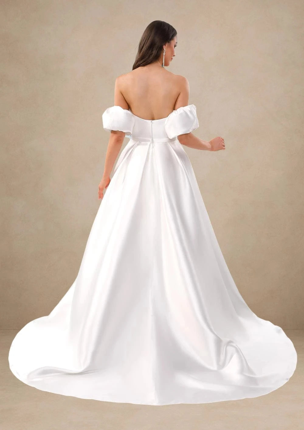 Les manches bouffantes détachables apportent une touche romantique et permettent de passer d’un style sophistiqué à une allure plus libre en un clin d’œil. Le buste reste bien maintenu grâce à une construction interne renforcée, même sans les manches. Un modèle idéal pour les mariées modernes qui veulent conjuguer tradition et liberté.